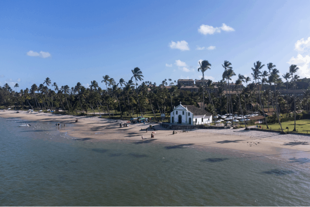 Um cenário de cartão-postal: coqueiros, igrejinha branca e um mar que parece espelho. A calma domina o dia e a sensação de paz é contagiante, excelente para famílias que buscam descanso de verdade.